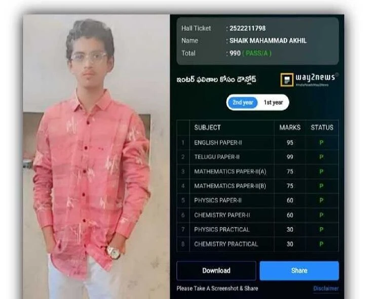 ఇంటర్ ఫలితాల్లో నందికొట్కూరుకు చెందిన షేక్ మహమ్మద్ అఖిల్ 1000/990 మార్కులతో సత్తాచాటారు. నంద్యాల జిల్లా మొదటి ర్యాంక్ సాధించారు. తల్లిదండ్రుల కష్టాన్ని దృష్టిలో ఉంచుకుని కష్టపడి చదివినందుకు తగిన ప్రతిఫలం దక్కిందని యువకుడు తెలిపారు. కళాశాల ప్రిన్సిపల్ బద్దుల శ్రీకాంత్, ఛైర్మన్ శ్రీధర్రెడ్డి, మ్యాథ్స్ లెక్చరర్ మధు విద్యార్థికి ప్రత్యేక అభినందనలు తెలిపారు.